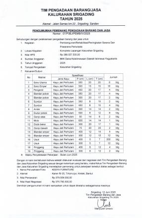Pengumuman Pemenang Pengadaan Barang dan Jasa Kalurahan Srigading